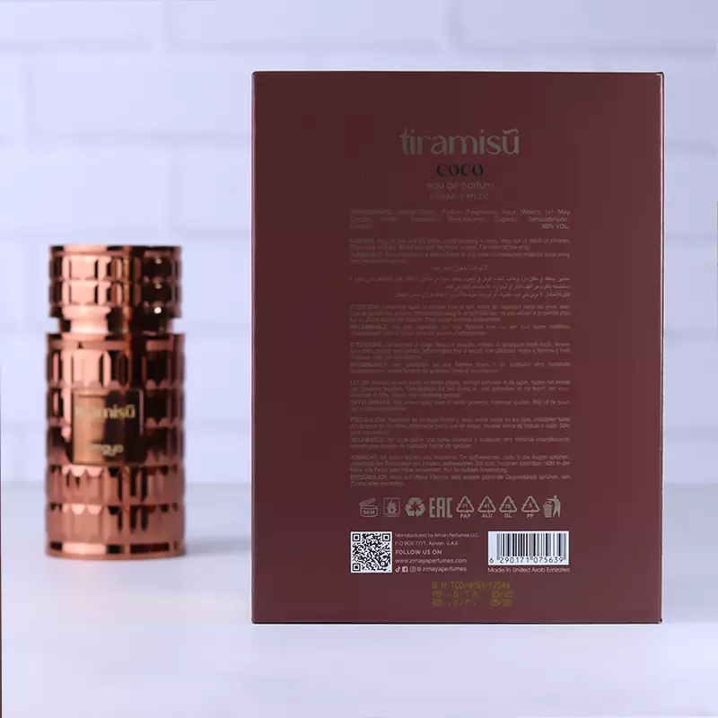 این بطری عطر با طراحی استوانهای و پوشش مسی براق، حس تجمل و اصالت را بهخوبی القا میکند. سطح آن با بافت هندسی تراشخورده، نور را به زیبایی بازتاب میدهد و ظاهری جذاب به آن بخشیده است. برچسبی با نوشتهی “tiramisu coco” در مرکز بطری قرار گرفته که هماهنگی خاصی با رنگ آن دارد. درپوش بزرگ و هماهنگ با بدنه، شکوه بیشتری به طراحی داده و بطری را به یک قطعه دکوراتیو شیک و چشمنواز تبدیل کرده است. این ادکلن درون یک جعبهی محکم و مقاوم قرار دارد. این جعبه زرشکی رنگ است و همچنین اطلاعات ادکلن روی آن نوشته شده است. رنگ این ادکلن با رایحه آن همخوانی دارد. ماندگاری این عطر بین 6 الی 8 ساعت میباشد. البته نوع اسپری کردن هم مهم است. اگر ادکلن را روی پوست تمیزی که اندکی چرب شده اسپری کنید، پخش بو و ماندگاری بهتری خواهد داشت. این ادکلن گرم مردانه و ادکلن گرم زنانه محدودیت ندارد و میتوانید به صورت روزانه از آن استفاده کنید و تاثیر روح انگیز آن را مشاهده کنید. این ادکلن یونیسکس هم برای استفاده شخصی خوب است و هم با توجه به رایحهی پرطرفدارش میتواند یک هدیه مناسب برای روز ولنتاین، هدیه تولد یا سالگرد ازدواج باشد. عطر زیمایا تیرامیسو کوکو 100 میل به چند دلیل یک ادکلن محبوب و پر کاربرد است: