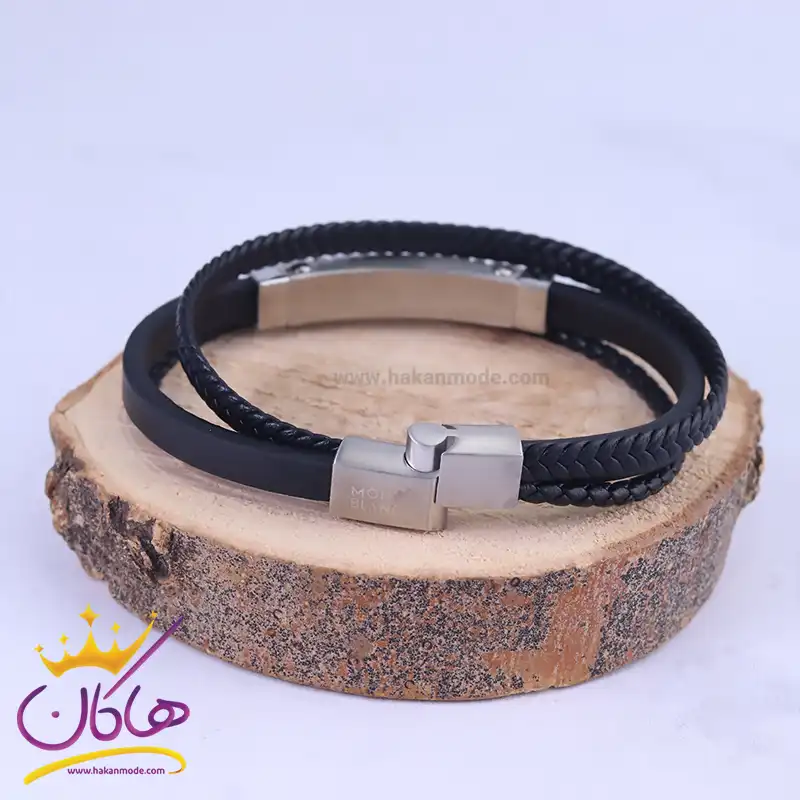 قیمت دستبند چرم مردانه مشکی سه لاین مونت بلان پلاک نقره ای و خرید عمده دستبند
