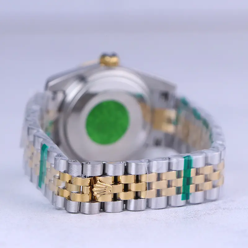 علاوه بر ویژگی های ظاهری اگر به داخل ساعت نگاه کنید، یک صفحه سبز رنگ مشاهده میکنید که اندکسهایی که زمان ساعت را نشان میدهند به شکل نگینی طراحی شدهاند. دور تا دور صفحه ساعت به صورت کنگرهای و طلایی است. لوگوی برند رولکس که شبیه یک تاج است روی عدد 12 به خوبی مشخص است. داشتن عقربههای شبنما به شما این امکان را میدهد که در شب و محیطهای کم نور هم گذر زمان را ببینید. تقویم روی عدد 3 قرار گرفته است و با شیشه ذرهبینی که دارد کاملا خوانا و واضح است. بند ساعت در وسط بافت ریزتری دارد که طلایی رنگ است و در کنارهها درشتتر و نقرهای میباشد. قفل این ساعت از نوع دوتکه چفتی است و ساعت به راحتی از دست نمیافتد. رولکس یکی از تولیدکنندههای محبوبترین ساعتهای مچی زنانه است.