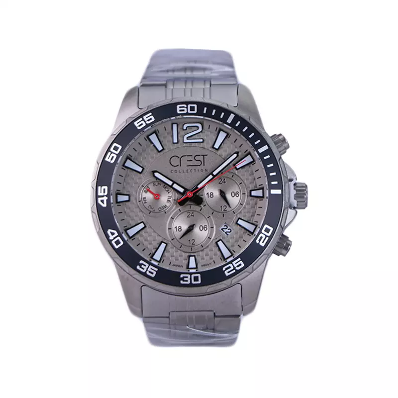 ساعت عقربه ای کرست مردانه فلزی ظاهری مدرن و جذاب دارد. این ساعت بند استیل نقرهای مات، رنگ ثابت و ضدحساسیت است. اصلیترین چیزی که در ساعت مردانه کرست توجه ما را به خود جلب میکند، سه صفحه دایرهای کوچک است، که درون صفحه هستند. دایرههای موجود در صفحهی بژ رنگ این ساعت، هر کدام نشان دهندهی پارامتری خاص هستند. یک صفحه ساعت را به صورت ۲۴ ساعت نشان میدهد. گزینه بعدی روزهای هفته را نشان میدهد. دایرهی بعدی نشان دهندهی ساعت جهانی است. در سمت راست یک مربع کوچک وجود دارد که نشانگر روزهای ماه بوده و همان تقویم ساعت نیز است. عقربهها مشکی، شبنما و اندکسها خطی و شبنما هستند. ثانیه شمار این ساعت قرمز رنگ طراحی شده است. اگر به درون صفحه نگاه کنید، نام برند crest زیر ساعت 12 دیده میشود. در کنار صفحه یک پیچ کوک و دو دکمه برای تنظیم زمان وجود دارد. بند ساعت، فلزی و از نوع استیل مرغوب است که باعث تعرق و خارش نمیشود. طرح این بند از یک بافت یکدست تشکیل شده است و قفل آن از مدل دوتکه دکمهدار است که از دسته قفلهای محکم و مطمئن است.