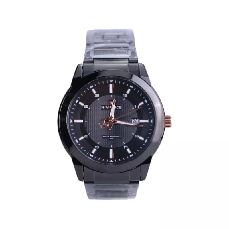 ساعت نیوی فورس مردانه ظاهری کلاسیک و جذاب دارد. این ساعت استیل مشکی، رنگ ثابت و ضدحساسیت است. اصلیترین چیزی که در ساعت نیوی فورس مردانه توجه ما را به خود جلب میکند قاب مشکی و گرد ساعت است. صفحهی این ساعت مشکی طرحدار بوده و اندکسهای آن خطی و شبنما طراحی شدهاند. همچنین عقربههای آن شبنما هستند. در کنار ساعت 3، تقویم ساعت وجود دارد. زیر ساعت 12 نام برند naviforce دیده میشود. در کنار صفحه یک پیچ کوک برای تنظیم زمان وجود دارد. بند ساعت، از بافت یکدستی تشکیل شده و مشکی است. همچنین جنس بند فلزی و از نوع استیل مرغوب است که باعث تعرق و خارش نمیشود. قفل آن از مدل دوتکه دکمهدار است که از دسته قفلهای محکم و مطمئن است.