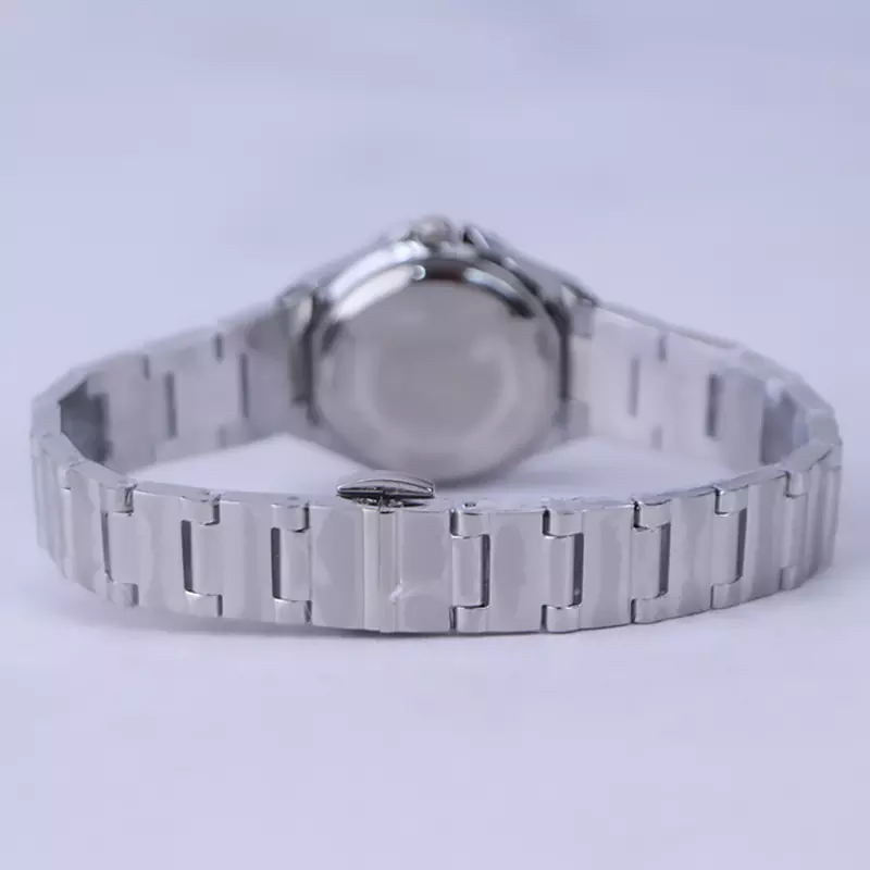 ساعت مچی الگانس زنانه استیل نقرهای ظاهری کلاسیک و جذاب دارد. این ساعت استیل، رنگ ثابت و ضدحساسیت است. اصلیترین چیزی که در ساعت زنانه الگانس توجه ما را به خود جلب میکند، قاب چندضلعی و صفحهی ساعت است. صفحهی ساعت سفید رنگ است اما تحت تاثیر شیشهی رنگی آن، به رنگ بژ دیده میشود و همین امر ظاهر ساعت را شیک و متفاوت کرده است. عقربهها، طلایی و اندکسها نگینی طراحی شده است. اگر به درون صفحهی ساعت نگاه کنید، نام برند Elegance زیر ساعت 12 دیده میشود. در کنار صفحه یک پیچ کوک برای تنظیم زمان وجود دارد. بند ساعت، فلزی و از نوع استیل مرغوب است که باعث تعرق و خارش نمیشود. بند ساعت از بافت یکدست تشکیل شده که نقرهای رنگ است و قفل آن از مدل پروانهای دکمهدار است که از دسته قفلهای محکم و مطمئن است.