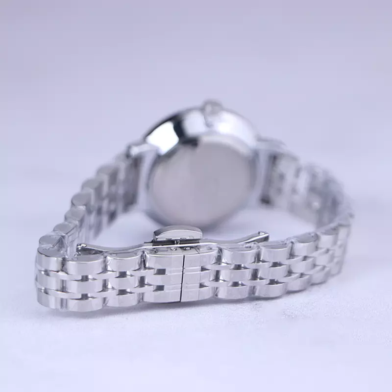 ساعت مچی الگانس زنانه استیل نقرهای ظاهری کلاسیک و جذاب دارد. این ساعت استیل، رنگ ثابت و ضدحساسیت است. اصلیترین چیزی که در ساعت زنانه الگانس توجه ما را به خود جلب میکند، همخوانی رنگ بند با قاب نقرهای رنگ ساعت است. صفحهی ساعت سرمهای بوده و عقربهها، نقرهای و اندکسها خطی و نقرهای هستند. اگر به درون صفحهی ساعت نگاه کنید، نام برند الگانس زیر ساعت 12 دیده میشود. در کنار صفحه یک پیچ کوک برای تنظیم زمان وجود دارد. بند ساعت، فلزی و از نوع استیل مرغوب است که باعث تعرق و خارش نمیشود. بند ساعت از یک بافت ریز و درشت تشکیل شده که نقرهای رنگ است و قفل آن از مدل پروانهای دکمهدار است که از دسته قفلهای محکم و مطمئن است.