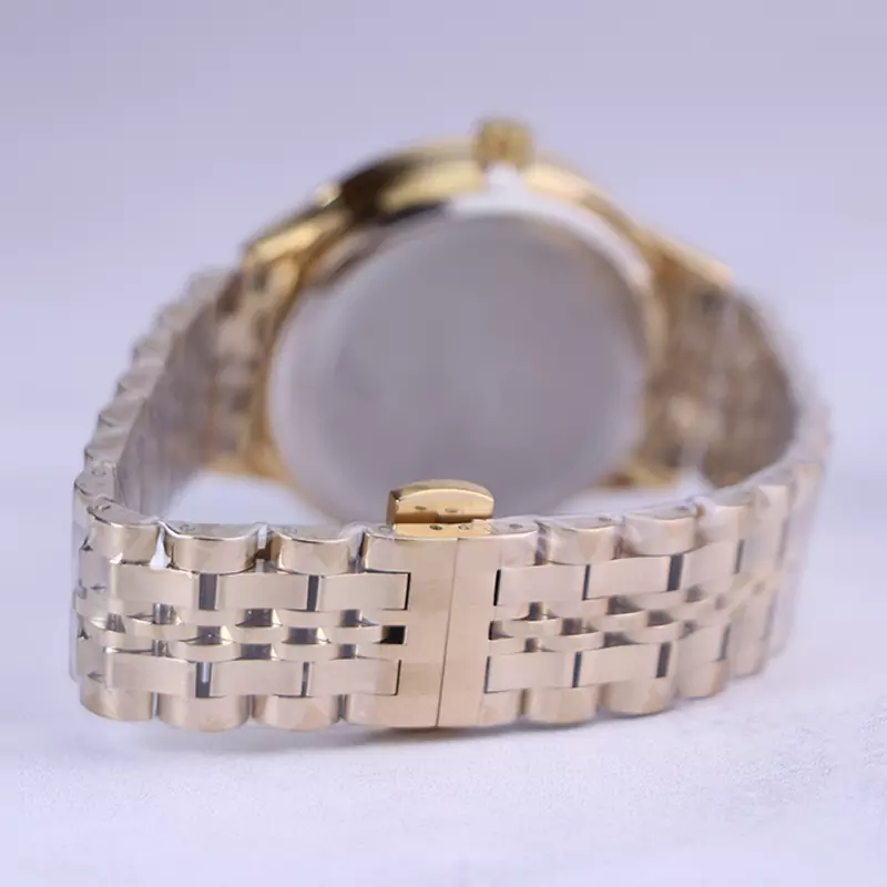 ساعت مچی مردانه فلزی الگانس ظاهری کلاسیک و جذاب دارد. این ساعت استیل، رنگ ثابت و ضدحساسیت است. اصلیترین چیزی که در ساعت مردانه الگانس توجه ما را به خود جلب میکند، همخوانی رنگ بند با قاب طلایی رنگ ساعت است. اگر به درون صفحهی مشکی ساعت نگاه کنید، نام برند الگانس زیر ساعت 12 دیده میشود. عقربهها، طلایی و اندکسها ترکیبی، خطی و لاتین هستند. یک مربع کوچک کنار عدد 3 قرار دارد که تقویم ساعت است. در کنار صفحه یک پیچ کوک برای تنظیم زمان وجود دارد. بند ساعت، فلزی و از نوع استیل مرغوب است که باعث تعرق و خارش نمیشود. بند ساعت از یک بافت ریز و درشت تشکیل شده که طلایی رنگ است و قفل آن از مدل پروانهای دکمهدار است که از دسته قفلهای محکم و مطمئن است.
