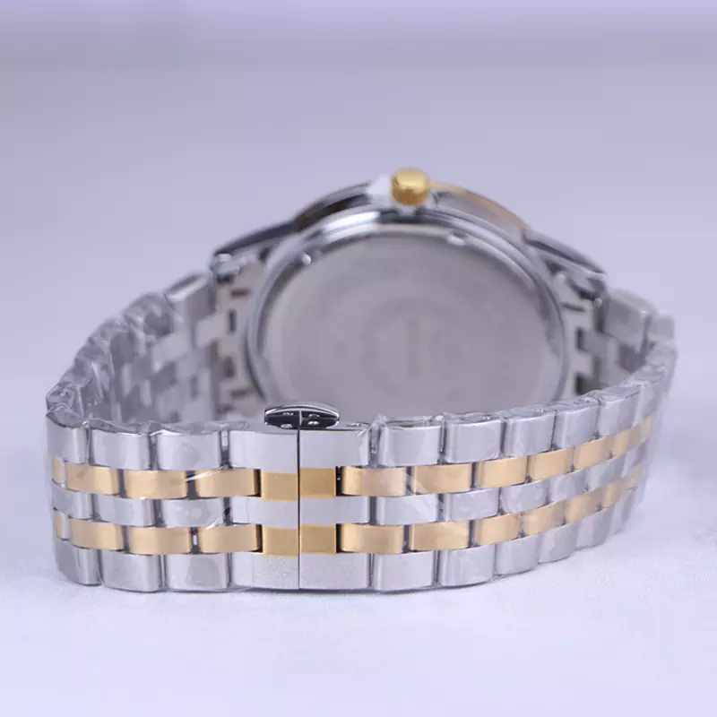 ساعت مچی مردانه فلزی الگانس ظاهری کلاسیک و جذاب دارد. این ساعت استیل، رنگ ثابت و ضدحساسیت است. اصلیترین چیزی که در ساعت مردانه الگانس توجه ما را به خود جلب میکند، همخوانی رنگ بند با قاب طلایی رنگ ساعت است. اگر به درون صفحهی سفید ساعت نگاه کنید، نام برند الگانس زیر ساعت 12 دیده میشود. عقربهها، شبنما و اندکسها ترکیبی، خطی و نگینی هستند. یک مربع کوچک کنار عدد 3 قرار دارد که تقویم ساعت است. در کنار صفحه یک پیچ کوک برای تنظیم زمان وجود دارد. بند ساعت، فلزی و از نوع استیل مرغوب است که باعث تعرق و خارش نمیشود. بند ساعت از یک بافت ریز و درشت تشکیل شده که قسمت میانی طلایی و کنارههای آن نقرهای است و قفل آن از مدل پروانهای دکمهدار است که از دسته قفلهای محکم و مطمئن است.