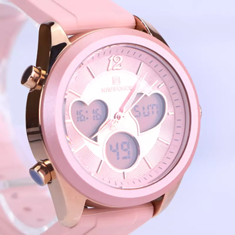 ساعت نیوی فورس ظاهری خاص و جذاب دارد. علاوه بر ویژگیهای ظاهری باید گفت این ساعت دو موتوره است و زمان را به دو صورت نشان میدهد. هم نمایش آنالوگ یعنی عقربهای دارد و هم به صورت دیجیتال نشان میدهد که میتوانید ساعت دیجیتال یا عقربهای خود را روی یک منطقهی زمانی دیگر تنظیم کنید و از ساعت کشور دیگر مطلع شوید. صفحهی صورتی رنگ ساعت با بافت دایرهای ظریف، حس لوکس و زنانهای به ساعت داده است. در مرکز صفحه سه نمایشگر دیجیتال قرار دارد که روز هفته، زمان و حالت شمارش معکوس را نمایش میدهند. دو پنجره قلبیشکل، طراحی فانتزی و متفاوت ساعت را برجستهتر کردهاند. عقربههای رزگلد در کنار اندکسهای خطی، خوانایی بالایی را فراهم میکنند. بند ساعت از جنس رابر مرغوب است که باعث تعرق و خارش نمی شود. قفل ساعت از نوع سگکی(کمربندی) است و ساعت به راحتی از دست نمیافتد. دو زمانه بودن این ساعت یکی از دلایل شیکی آن است. اگر به درون صفحه نگاه کنید، نام برند نیوی فورس بالای ساعت دیده میشود. در کنار صفحه چهار دکمه برای تنظیم زمان و ساعت وجود دارد.