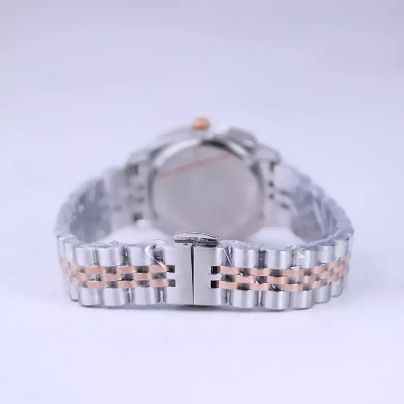 ساعت مچی سولیدا زنانه استیل نقرهای رزگلد ظاهری کلاسیک و جذاب دارد. این ساعت استیل، رنگ ثابت و ضدحساسیت است. اصلیترین چیزی که در ساعت زنانه سولیدا توجه ما را به خود جلب میکند، قاب مربع شکل و صفحهی سفید رنگ ساعت است. عقربهها، رزگلد و اندکسها خطی هستند. یک دایره کوچک کنار عدد 3 قرار دارد که تقویم ساعت است. اگر به درون صفحهی ساعت نگاه کنید، نام برند solida زیر ساعت 12 دیده میشود. در کنار صفحه یک پیچ کوک برای تنظیم زمان وجود دارد. بند ساعت، فلزی و از نوع استیل مرغوب است که باعث تعرق و خارش نمیشود. بند ساعت از یک بافت ریز و درشت تشکیل شده که قسمت میانی آن رزگلد و کنارههای آن نقرهای است. قفل آن از مدل پروانهای دکمهدار است که از دسته قفلهای محکم و مطمئن است.