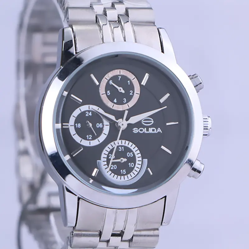 ساعت سولیدا زنانه فلزی ظاهری کلاسیک و جذاب دارد. این ساعت بند استیل نقرهای، رنگ ثابت و ضدحساسیت است. اصلیترین چیزی که در ساعت زنانه سولیدا توجه ما را به خود جلب میکند، سه صفحه دایرهای کوچک است، که درون صفحه هستند. دایرههای موجود در صفحهی مشکی ساعت، هر کدام نشان دهندهی پارامتری خاص هستند. صفحهی سمت چپ، ساعت را به صورت ۲۴ ساعت نشان میدهد. صفحهی بالایی روزهای هفته را نشان میدهد. دایرهی پایینی نشان دهندهی روزهای ماه است. اندکسها، خطی نقرهای و عقربهها نقرهای هستند. اگر به درون صفحه نگاه کنید، نام برند solida کنار ساعت 3 دیده میشود. در کنار صفحه سه پیچ کوک برای تنظیم زمان وجود دارد. بند ساعت، فلزی و از نوع استیل مرغوب است که باعث تعرق و خارش نمیشود. طرح این بند از یک بافت ریز و درشت تشکیل شده است و قفل آن از مدل پروانهای دکمهدار است که از دسته قفلهای محکم و مطمئن است.