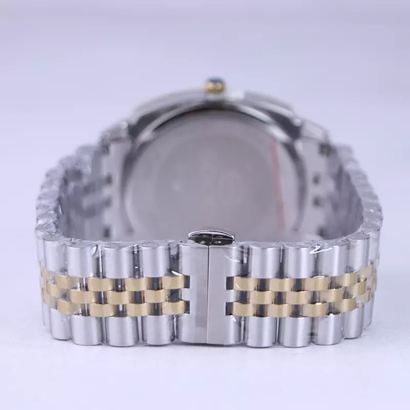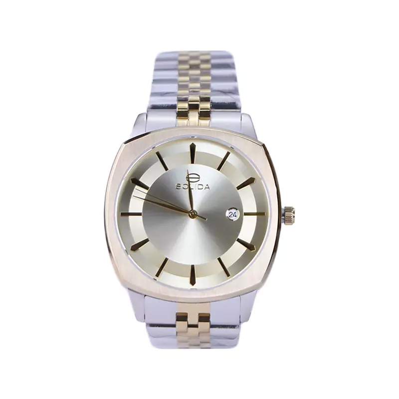 ساعت سولیدا مردانه ظاهری کلاسیک و جذاب دارد. اصلیترین چیزی که در ساعت مردانه سولیدا توجه ما را به خود جلب میکند، قاب مربع شکل و طلایی رنگ ساعت است. اگر به درون صفحهی طلایی رنگ ساعت نگاه کنید، متوجه میشوید که اندکسهای این ساعت بهصورت خطی طراحی شدهاند. یک دایره کوچک کنار عدد 3 قرار دارد که تقویم ساعت است. نام برند solida زیر ساعت 12 دیده میشود. در کنار صفحه یک پیچ کوک برای تنظیم زمان وجود دارد. این ساعت بند استیل، رنگ ثابت و ضدحساسیت است. بند ساعت از بافت ریز و درشت تشکیل شده که قسمت میانی طلایی و کنارههای نقرهای رنگ است. این بند باعث تعرق و خارش نمیشود و قفل آن از مدل پروانهای دکمهدار است که از دسته قفلهای محکم و مطمئن است.