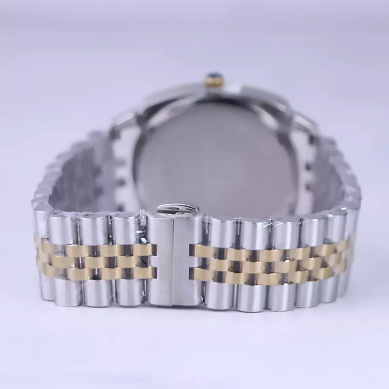 ساعت سولیدا مردانه ظاهری کلاسیک و جذاب دارد. اصلیترین چیزی که در ساعت مردانه سولیدا توجه ما را به خود جلب میکند، قاب مربع شکل و طلایی رنگ ساعت است. اگر به درون صفحهی سفید رنگ ساعت نگاه کنید، متوجه میشوید که اندکسهای این ساعت بهصورت خطی طراحی شدهاند. یک دایره کوچک کنار عدد 3 قرار دارد که تقویم ساعت است. نام برند solida زیر ساعت 12 دیده میشود. در کنار صفحه یک پیچ کوک برای تنظیم زمان وجود دارد. این ساعت بند استیل، رنگ ثابت و ضدحساسیت است. بند ساعت از بافت ریز و درشت تشکیل شده که قسمت میانی طلایی و کنارههای آن نقرهای رنگ است. این بند باعث تعرق و خارش نمیشود و قفل آن از مدل پروانهای دکمهدار است که از دسته قفلهای محکم و مطمئن است.