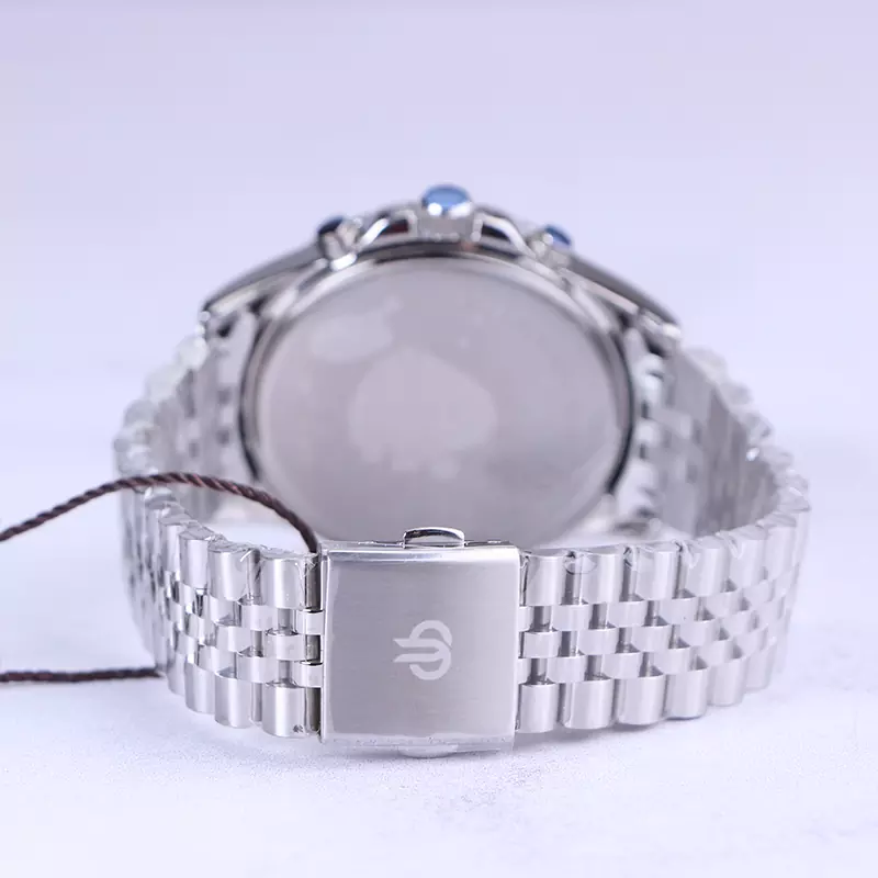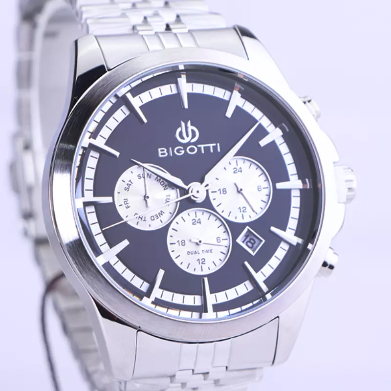 ساعت بیگوتی مردانه فلزی ظاهری مدرن و جذاب دارد. این ساعت استیل نقرهای، رنگ ثابت و ضدحساسیت است. اگر به داخل ساعت نگاه کنید، صفحهی این ساعت به رنگ مشکی است و سه صفحه دایرهای نقرهای کوچک میبینید که هر کدام از آنها نشان دهندهی پارامتری خاص هستند. یک صفحه که سمت چپ قرار دارد روزهای هفته را نشان میدهد. صفحهی سمت راست ساعت را به صورت 24 ساعته نشان میدهد. اگر از افرادی هستید که امور خود را بر اساس تایم 24 ساعته تنظیم میکنید این صفحه کوچک به کار شما میآید. صفحهی پایینی، dual time یا دو زمانه است. ساعت دو زمانه ساعتی است که به طور هم زمان میتواند دو زمان مختلف مربوط به دو منطقه متفاوت را نمایش دهد. به صورتی که میتوانید با داشتن این ساعت زمان دو کشور متفاوت را در صفحهی این ساعت داشته باشید. یک مربع کوچک بین اعداد 4 و 5 قرار دارد که همان تقویم ساعت است. بند ساعت، از بافت یکدستی تشکیل شده و از نوع فلز مرغوب است که باعث تعرق و خارش نمیشود. اندکسهای این ساعت به صورت خطی نقرهای و عقربههای آن نقرهای طراحی شدهاند. لوگوی برند بیگوتی را زیر عدد 12 میبینید. قفل این ساعت از نوع دوتکه دکمهدار است. در کنار صفحه یک پیچ کوک و دو دکمه برای تنظیم زمان وجود دارد.