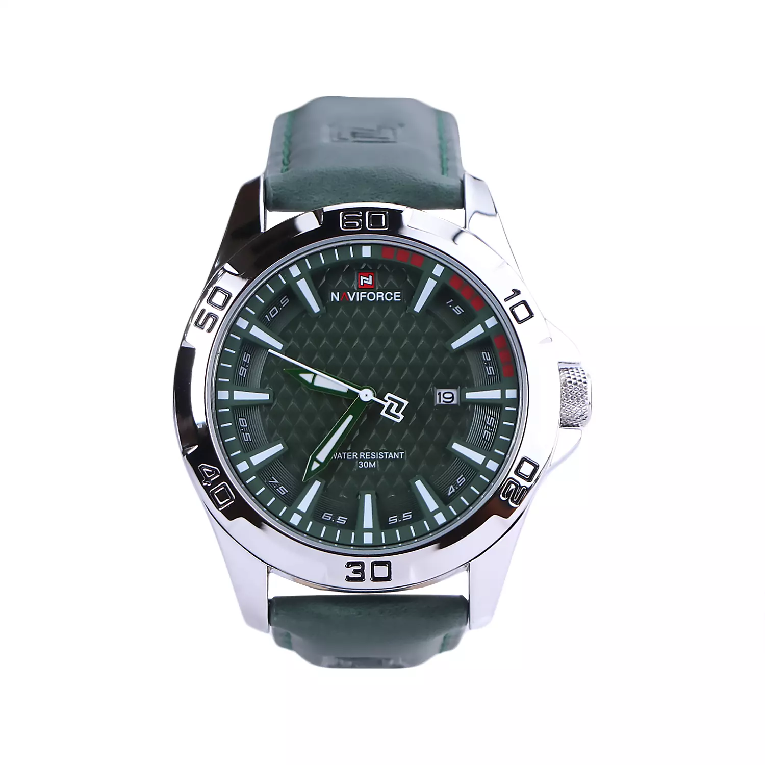 ساعت مچی نیوی فورس مردانه بند جیر ظاهری کلاسیک و جذاب دارد. قاب این ساعت استیل نقرهای، رنگ ثابت و ضدحساسیت است. اصلیترین چیزی که در ساعت نیوی فورس مردانه توجه ما را به خود جلب میکند، صفحهی سبز رنگ و طرحدار ساعت بوده که اندکسهای ساعت خطی و شبنما هستند و عقربههای آن شبنما هستند. نام برند naviforce زیر ساعت 12 دیده میشود. یک مربع کوچک کنار عدد 3 قرار دارد که تقویم ساعت است. در کنار صفحه یک پیچ کوک برای تنظیم زمان وجود دارد. بند ساعت از جنس جیر مرغوب است که این بند دولایه میباشد. لایهی زیری، رابر و لایهی رویی از جنس جیر سبز میباشد که پوسته پوسته و بریده نمیشود. این بند باعث تعرق و خارش نمیشود و قفل آن از مدل کمربندی(سگکی) است که از دسته قفلهای محکم و مطمئن است.