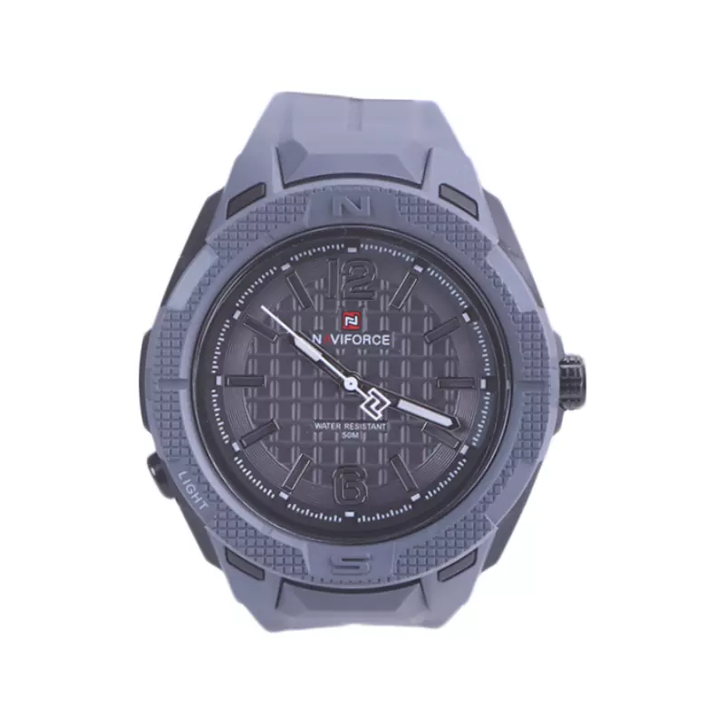 این مدل ساعت نیوی فورس مردانه ظاهری جذاب و شیک دارد. اگر به درون صفحهی ساعت دقت کنید، یک صفحه طوسی رنگ مشاهده میکنید که اندکسهای این ساعت به صورت خطی و عددی هستند به همراه برند نیوی فورس که زیر ساعت 12 به چشم میآید. وجود عقربههای شبنما بر جذابیت این ساعت افزوده است. این ساعت Naviforce دارای یک ویژگی خاص است؛ در کنار صفحه یک دکمه طراحی شده که با فشردن آن، چراغ داخلی فعال میشود و اندکسها (اعداد و نشانگرهای ساعت) روشن میگردند. این قابلیت باعث میشود بتوانید حتی در تاریکی به راحتی زمان را مشاهده کنید و جلوهای مدرن و جذاب به ساعت میبخشد. بند این ساعت به رنگ طوسی و از جنس رابر مرغوب است. قفل این ساعت از نوع سگکی است و ساعت به راحتی از دست نمیافتد.