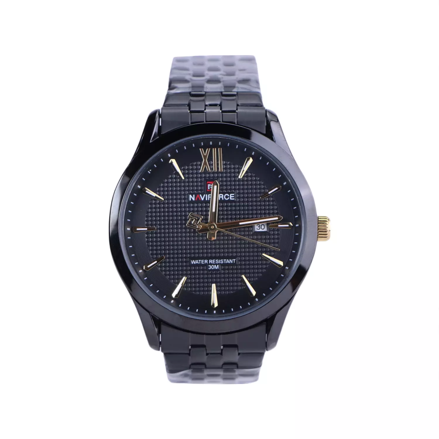 ساعت مچی نیوی فورس مردانه استیل مشکی ظاهری کلاسیک و جذاب دارد. این ساعت استیل، رنگ ثابت و ضدحساسیت است. اصلیترین چیزی که در ساعت مردانه نیوی فورس توجه ما را به خود جلب میکند، قاب گرد و مشکی رنگ ساعت است. اگر به درون صفحهی مشکی رنگ ساعت نگاه کنید، عقربهها، شبنما و اندکسها خطی و شبنما هستند. یک مربع کوچک در کنار موقعیت ساعت 3 قرار دارد که تقویم ساعت است. نام برند naviforce زیر ساعت 12 دیده میشود. در کنار صفحه یک پیچ کوک برای تنظیم زمان وجود دارد. بند ساعت، فلزی و از نوع استیل مرغوب است که باعث تعرق و خارش نمیشود. بند ساعت از یک بافت ریز و درشت تشکیل شده و مشکی است. قفل آن از مدل پروانهای دکمهدار است که از دسته قفلهای محکم و مطمئن است.