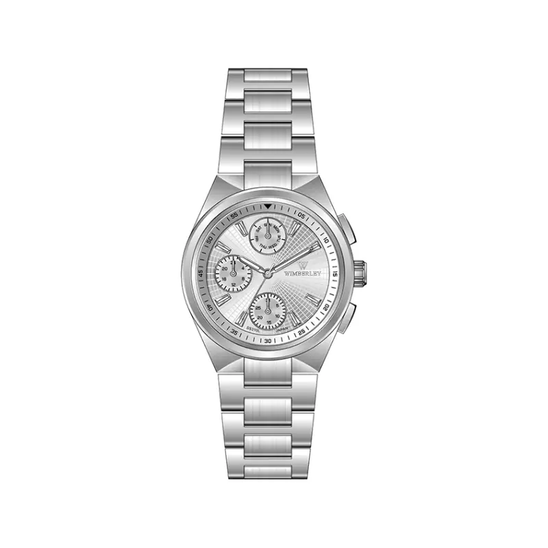 ساعت ویمبرلی زنانه فلزی ظاهری کلاسیک و جذاب دارد. این ساعت بند استیل نقرهای، رنگ ثابت و ضدحساسیت است. اصلیترین چیزی که در ساعت زنانه ویمبرلی توجه ما را به خود جلب میکند، سه صفحه دایرهای کوچک است، که درون صفحه هستند. دایرههای موجود در صفحهی سفید ساعت، هر کدام نشان دهندهی پارامتری خاص هستند. صفحهی سمت چپ، ساعت را به صورت ۲۴ ساعت نشان میدهد. صفحهی بالایی روزهای هفته را نشان میدهد. دایرهی پایینی نشان دهندهی روزهای ماه است. اندکسها، خطی نقرهای و عقربهها شبنما هستند. اگر به درون صفحه نگاه کنید، نام برند ویمبرلی کنار ساعت 3 دیده میشود. در کنار صفحه یک پیچ کوک و دو دکمه برای تنظیم زمان وجود دارد. بند ساعت، فلزی و از نوع استیل مرغوب است که باعث تعرق و خارش نمیشود. طرح این بند از یک بافت ریز و درشت تشکیل شده که نقرهای رنگ است و قفل آن از مدل پروانهای دکمهدار است که از دسته قفلهای محکم و مطمئن است.