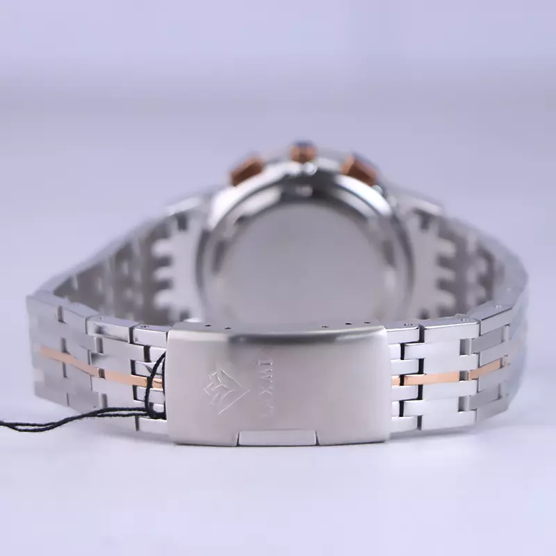 ساعت لاکسمی زنانه فلزی ظاهری مدرن و جذاب دارد. این ساعت استیل نقرهای رزگلد، رنگ ثابت و ضدحساسیت است. اگر به داخل ساعت نگاه کنید، صفحهی این ساعت به رنگ مشکی است اما تحت تاثیر شیشهی رنگی آن، به رنگ قهوهای نشان داده میشود. درون صفحه سه صفحه دایرهای کوچک میبینید که هر کدام از آنها نشان دهندهی پارامتری خاص هستند. یک صفحه که سمت چپ قرار دارد ثانیه شمار کرنوگراف را نشان میدهد. دایرهی پایینی نشانگر تایم دقیقه کرنوگراف است و صفحهی سمت راست ساعت را به صورت 24 ساعت نشان میدهد. اگر از افرادی هستید که امور خود را بر اساس تایم 24 ساعته تنظیم میکنید این صفحه کوچک به کار شما میآید. یک دایره کوچک بین اعداد 4 و 5 قرار دارد که همان تقویم ساعت است. بند ساعت، از بافت ریز و درشت تشکیل شده که قسمت میانی رزگلد و کنارههای آن نقرهای رنگ است. این بند از نوع فلز مرغوب است که باعث تعرق و خارش نمیشود. اندکسهای این ساعت خطی رزگلد و عقربههای آن شبنما طراحی شدهاند. لوگوی برند لاکسمی را زیر عدد 12 میبینید. قفل این ساعت از نوع دوتکه است. در کنار صفحه یک پیچ کوک و دو دکمه برای تنظیم زمان وجود دارد.
