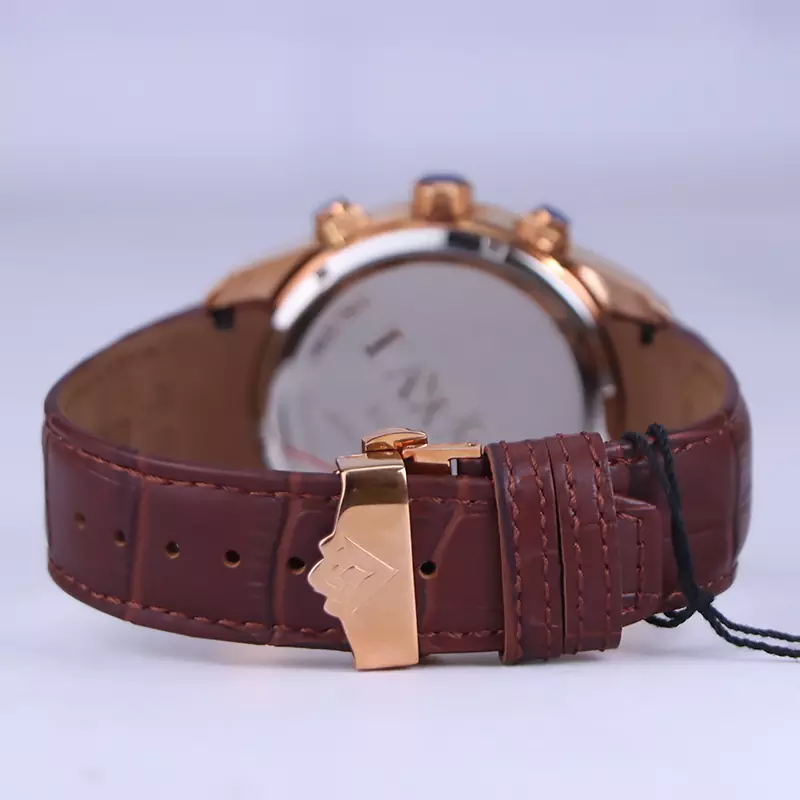ساعت لاکسمی مردانه بند چرمی ظاهری مدرن و جذاب دارد. قاب ساعت به رنگ استیل رزگلد، رنگ ثابت و ضدحساسیت است. علاوه بر ویژگیهای ظاهری اگر به داخل ساعت نگاه کنید، سه صفحه دایرهای کوچک میبینید. دایرههای موجود در صفحهی سفید رنگ ساعت شما هر کدام نشان دهندهی پارامترهای کرنوگراف است. صفحهی سمت راست ساعت را به صورت 24 ساعت نشان میدهد. یک مربع کوچک بین اعداد 4 و 5 قرار دارد که تقویم ساعت است. داشتن عقربههای شبنما به شما این امکان را میدهد که در شب و محیطهای کم نور هم گذر زمان را ببینید. در کنار این ساعت یک پین (دسته کوک) و دو دکمه قرار دارد که پین برای تنظیم تقویم و ساعت است و دکمهی بالا جهت استارت موتور کرنوگراف آن میباشد. دکمهی پایین جهت ریست کردن تایمر آن قرار گرفته است. قفل این ساعت از نوع پروانهای قفلدار است و ساعت به راحتی از دست نمیافتد. اگر به درون صفحه نگاه کنید، نام برند laxmi زیر ساعت 12 دیده میشود. بند ساعت از نوع چرم مرغوب که پوسته پوسته و بریده نمیشود. این بند باعث تعرق و خارش نمیشود.