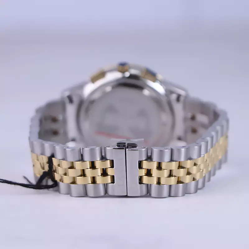ساعت لاکسمی زنانه فلزی ظاهری مدرن و جذاب دارد. این ساعت استیل نقرهای طلایی، رنگ ثابت و ضدحساسیت است. اگر به داخل ساعت نگاه کنید، صفحهی این ساعت به رنگ سفید است و سه صفحه دایرهای کوچک میبینید که هر کدام از آنها نشان دهندهی پارامتری خاص هستند. یک صفحه که سمت چپ قرار دارد ثانیه شمار کرنوگراف را نشان میدهد. دایرهی پایینی نشانگر تایم دقیقه کرنوگراف است و صفحهی بالایی ساعت را به صورت 24 ساعت نشان میدهد. اگر از افرادی هستید که امور خود را بر اساس تایم 24 ساعته تنظیم میکنید این صفحه کوچک به کار شما میآید. یک مربع کوچک کنار عدد 3 قرار دارد که همان تقویم ساعت است. بند ساعت، طرح رولکسی است که قسمت میانی طلایی و کنارههای آن نقرهای رنگ است. این بند از نوع فلز مرغوب است که باعث تعرق و خارش نمیشود. اندکسهای این ساعت خطی و طلایی و عقربههای آن طلایی و شبنما طراحی شدهاند. لوگوی برند لاکسمی را کنار عدد 3 میبینید. قفل این ساعت از نوع پروانهای دکمهدار است. در کنار صفحه یک پیچ کوک و دو دکمه برای تنظیم زمان وجود دارد.