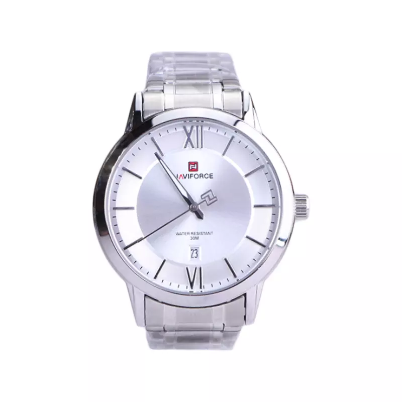 ساعت مچی نیوی فورس مردانه استیل نقرهای ظاهری کلاسیک و جذاب دارد. این ساعت استیل، رنگ ثابت و ضدحساسیت است. اصلیترین چیزی که در ساعت مردانه نیوی فورس توجه ما را به خود جلب میکند، قاب گرد و نقرهای رنگ ساعت است. اگر به درون صفحهی سفید رنگ ساعت نگاه کنید، عقربهها، شبنما و اندکسها خطی هستند. یک مربع کوچک در کنار موقعیت ساعت 6 قرار دارد که تقویم ساعت است. نام برند naviforce زیر ساعت 12 دیده میشود. در کنار صفحه یک پیچ کوک برای تنظیم زمان وجود دارد. بند ساعت، فلزی و از نوع استیل مرغوب است که باعث تعرق و خارش نمیشود. بند ساعت از یک بافت ریز و درشت تشکیل شده و نقرهای است. قفل آن از مدل دوتکه دکمهدار است که از دسته قفلهای محکم و مطمئن است.