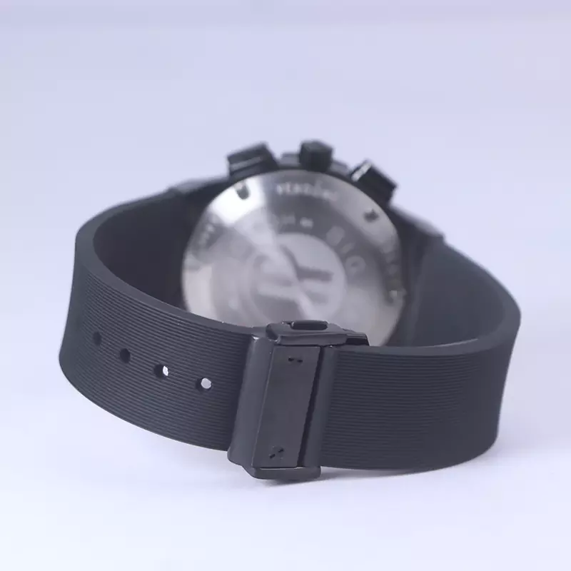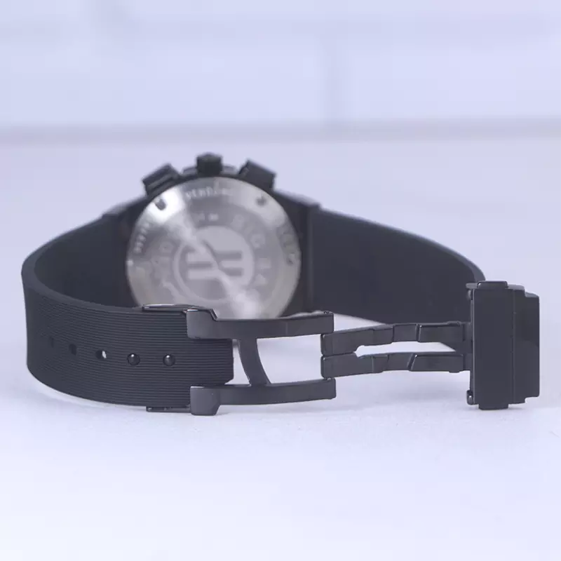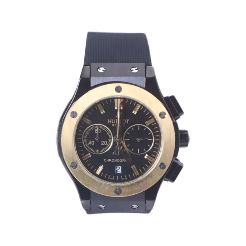 علاوه بر ویژگی های ظاهری اگر به داخل ساعت نگاه کنید، یک صفحه مشکی ساده مشاهده میکنید. در این ساعت دو صفحه دایرهی کوچک مشکی رنگ، برای کرنوگراف و دقیقه شمار قرار گرفته است. دایرههای موجود در صفحهی ساعت شما هر کدام نشان دهندهی پارامتری خاص هستند. صفحه سمت چپی برای نشان دادن دقیقه و کرنوگراف است و دایره سمت راستی زمان را به صورت 24 ساعته نشان میدهد. اگر از افرادی هستید که امور خود را بر اساس تایم 24 ساعته تنظیم میکنید این صفحه کوچک به کار شما میآید. یک مربع کوچک بالای عدد 6 وجود دارد که نشان دهندهی تقویم ساعت است. قاب ساعت به شکل دایره است که دور تا دور آن با پیچهایی تزئین شده است. داشتن اندکسها و عقربههای خطی طلایی و براق به شما این امکان را میدهد که در شب و محیطهای کم نور هم گذر زمان را ببینید. بند ساعت از نوع رابر مرغوب و ضد حساسیت است. این بند باعث تعرق و خارش نمیشود. اگر به درون صفحه دقت کنید، نام برند hublot زیر ساعت 12 دیده میشود. در کنار صفحه سه پین کوک برای تنظیم زمان و کرنوگراف وجود دارد. قفل آن از مدل کلیپسی است که از دسته قفلهای محکم و مطمئن بشمار میرود.