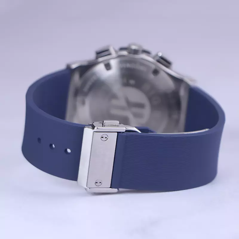 علاوه بر ویژگیهای ظاهری اگر به داخل ساعت نگاه کنید، یک صفحه آبی ساده مشاهده میکنید. در این ساعت دو صفحه دایرهی کوچک آبی رنگ، برای کرنوگراف و دقیقه شمار قرار گرفته است. دایرههای موجود در صفحهی ساعت شما هر کدام نشان دهندهی پارامتری خاص هستند. صفحه سمت چپی برای نشان دادن دقیقه و کرنوگراف است و دایره سمت راستی زمان را به صورت 24 ساعته نشان میدهد. اگر از افرادی هستید که امور خود را بر اساس تایم 24 ساعته تنظیم میکنید این صفحه کوچک به کار شما میآید. یک مربع کوچک بالای عدد 6 وجود دارد که نشان دهندهی تقویم ساعت است. قاب ساعت نقرهای رنگ و به شکل دایرهای بوده که دور تا دور آن با پیچهایی تزئین شده است. داشتن اندکسها و عقربههای خطی نقرهای و براق به شما این امکان را میدهد که در شب و محیطهای کم نور هم گذر زمان را ببینید. بند ساعت از نوع رابر مرغوب و ضد حساسیت است. این بند باعث تعرق و خارش نمیشود. اگر به درون صفحه دقت کنید، نام برند hublot زیر ساعت 12 دیده میشود. در کنار صفحه سه پین کوک برای تنظیم زمان و کرنوگراف وجود دارد. قفل آن از مدل کلیپسی است که از دسته قفلهای محکم و مطمئن بشمار میرود.