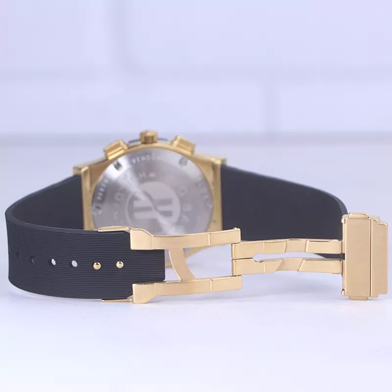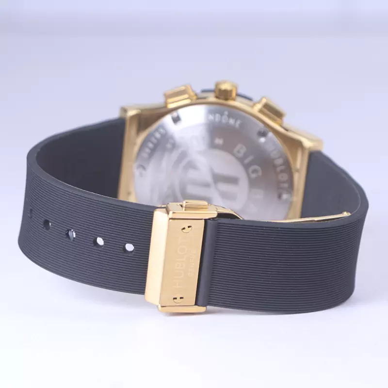 علاوه بر ویژگیهای ظاهری اگر به داخل ساعت نگاه کنید، یک صفحه مشکی ساده مشاهده میکنید. در این ساعت دو صفحه دایرهی کوچک قاب طلایی، برای کرنوگراف و دقیقه شمار قرار گرفته است. دایرههای موجود در صفحهی ساعت شما هر کدام نشان دهندهی پارامتری خاص هستند. صفحه سمت چپی برای نشان دادن دقیقه و کرنوگراف است و دایره سمت راستی زمان را به صورت 24 ساعته نشان میدهد. اگر از افرادی هستید که امور خود را بر اساس تایم 24 ساعته تنظیم میکنید این صفحه کوچک به کار شما میآید. یک مربع کوچک بالای عدد 6 وجود دارد که نشان دهندهی تقویم ساعت است. قاب ساعت به شکل دایره است که دور تا دور آن با پیچهایی تزئین شده است. داشتن اندکسهای خطی طلایی و عقربههای براق به شما این امکان را میدهد که در شب و محیطهای کم نور هم گذر زمان را ببینید. بند ساعت از جنس رابر مرغوب است که از تعرق و خارش جلوگیری میکند. اگر به درون صفحه دقت کنید، نام برند hublot زیر ساعت 12 دیده میشود. در کنار صفحه سه پین کوک برای تنظیم زمان و کرنوگراف وجود دارد. قفل آن از مدل کلیپسی است که از دسته قفلهای محکم و مطمئن بشمار میرود.