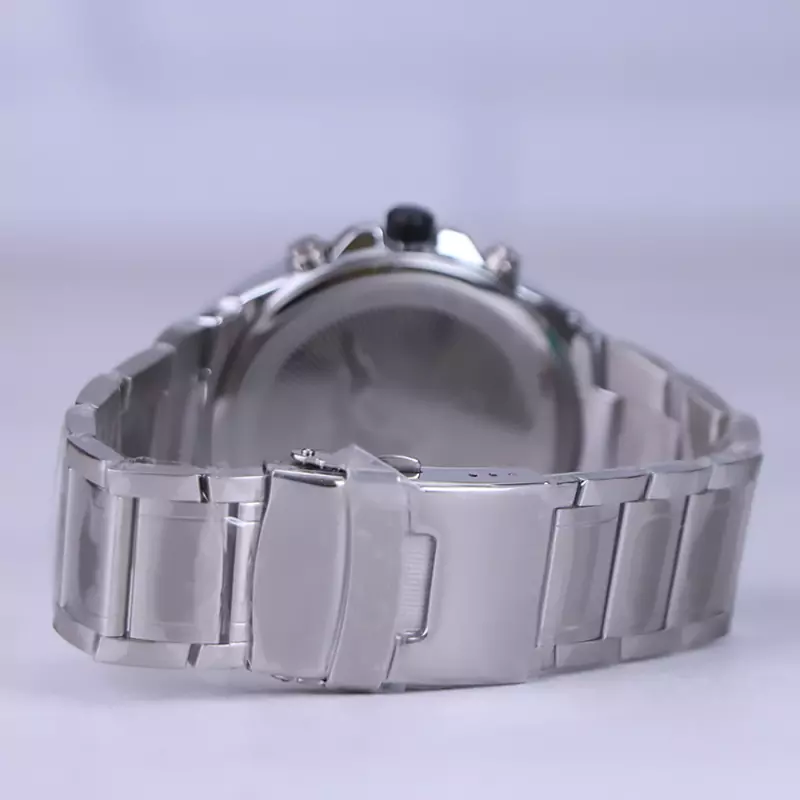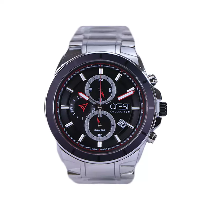ساعت عقربه ای کرست مردانه فلزی ظاهری مدرن و جذاب دارد. این ساعت بند استیل نقرهای، رنگ ثابت و ضدحساسیت است. اصلیترین چیزی که در ساعت مردانه کرست توجه ما را به خود جلب میکند، سه صفحه دایرهای کوچک است، که درون صفحه هستند. دایرههای موجود در صفحهی مشکی رنگ این ساعت، هر کدام نشان دهندهی پارامتری خاص هستند. یک صفحه ساعت را به صورت ۲۴ ساعت نشان میدهد. گزینه بعدی روزهای هفته را نشان میدهد. دایرهی بعدی نشان دهندهی ساعت جهانی است. در سمت راست یک مربع کوچک وجود دارد که نشانگر روزهای ماه بوده و همان تقویم ساعت نیز است. عقربهها نقرهای، شبنما و اندکسها خطی و شبنما هستند. ثانیه شمار این ساعت قرمز رنگ طراحی شده است. اگر به درون صفحه نگاه کنید، نام برند crest کنار ساعت 3 دیده میشود. در کنار صفحه یک پیچ کوک و دو دکمه برای تنظیم زمان وجود دارد. بند ساعت، فلزی و از نوع استیل مرغوب است که باعث تعرق و خارش نمیشود. طرح این بند از یک بافت یکدست تشکیل شده است و قفل آن از مدل دوتکه قفلدار است که از دسته قفلهای محکم و مطمئن است.