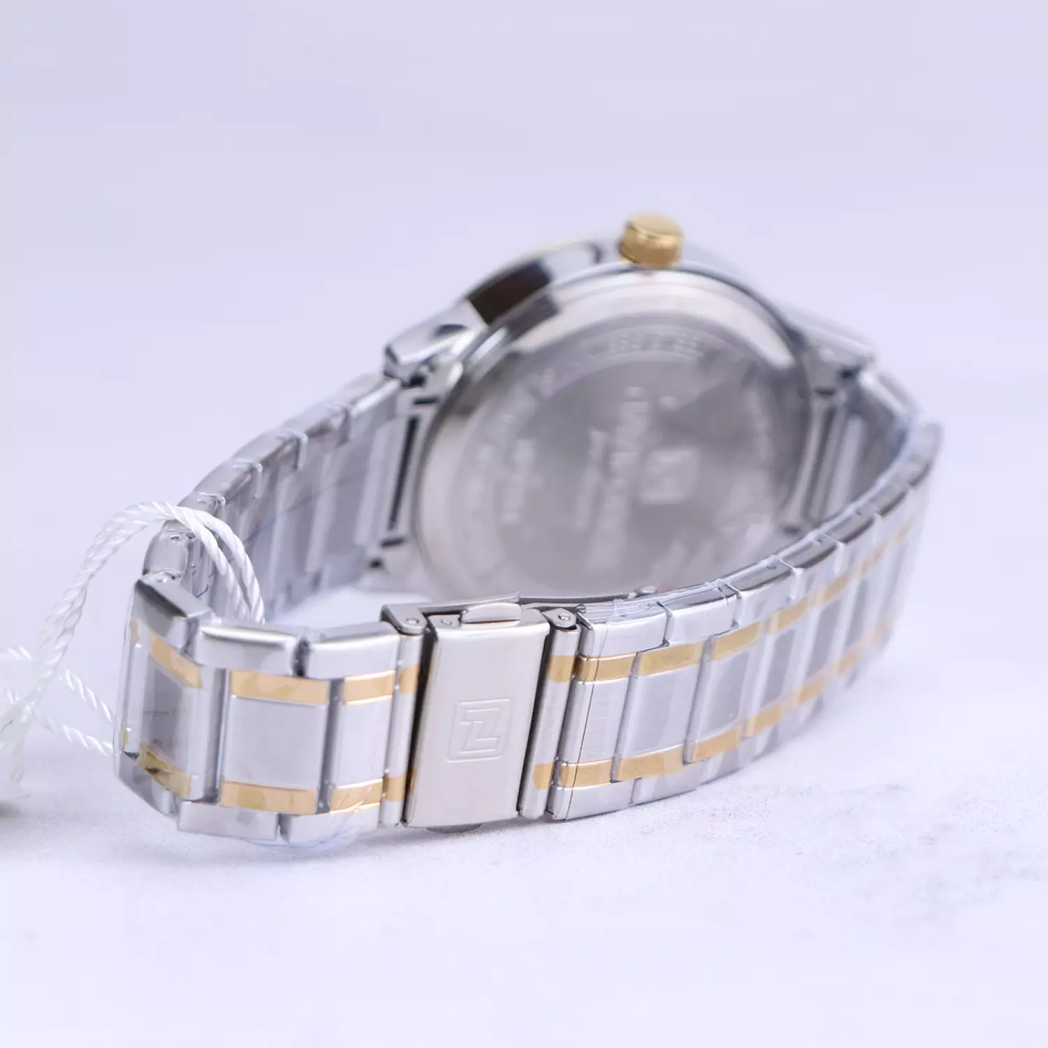 ساعت مچی نیوی فورس مردانه استیل نقرهای طلایی ظاهری کلاسیک و جذاب دارد. این ساعت استیل، رنگ ثابت و ضدحساسیت است. اصلیترین چیزی که در ساعت مردانه نیوی فورس توجه ما را به خود جلب میکند، قاب گرد و طلایی رنگ ساعت است. اگر به درون صفحهی مشکی رنگ ساعت نگاه کنید، عقربهها، شبنما و اندکسها خطی هستند. یک مربع کوچک در کنار موقعیت ساعت 6 قرار دارد که تقویم ساعت است. نام برند naviforce زیر ساعت 12 دیده میشود. در کنار صفحه یک پیچ کوک برای تنظیم زمان وجود دارد. بند ساعت، فلزی و از نوع استیل مرغوب است که باعث تعرق و خارش نمیشود. بند ساعت از یک بافت ریز و درشت تشکیل شده که قسمت میانی طلایی و کنارههای آن نقرهای رنگ است. قفل آن از مدل دوتکه دکمهدار است که از دسته قفلهای محکم و مطمئن است.